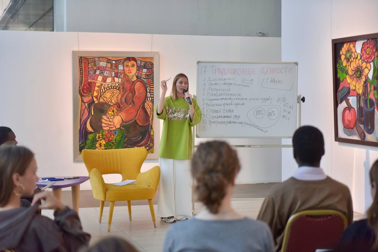 В дискуссии о российских ценностях приняли участие студенты 15 государств. С ребятами также пообщались руководитель Дома народов России Анна Полежаева, губернатор Свердловской области Денис Паслер и учредитель МЦИ «Главный Проспект» Олег Гусев. В творческом пространстве Урала о ценностях не только говорили, но и рисовали. На художественном мастер-классе участники проекта запечатлели своё понимание ценностей на холсте.