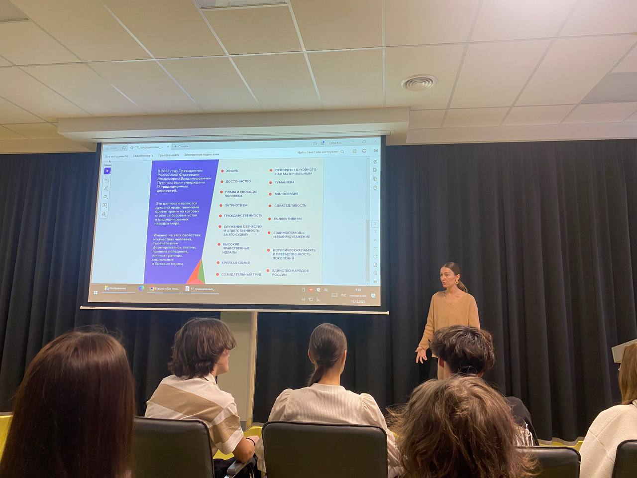 Координатор проекта Алёна Федосеевна провела для обучающихся подробный экскурс по каждой из 17 ценностей, утвержденных Указом Президента Владимира Путина. Она раскрыла их глубокий смысл, показав, как эти нравственные ориентиры, передающиеся из поколения в поколение, формируют основу нашего общества.