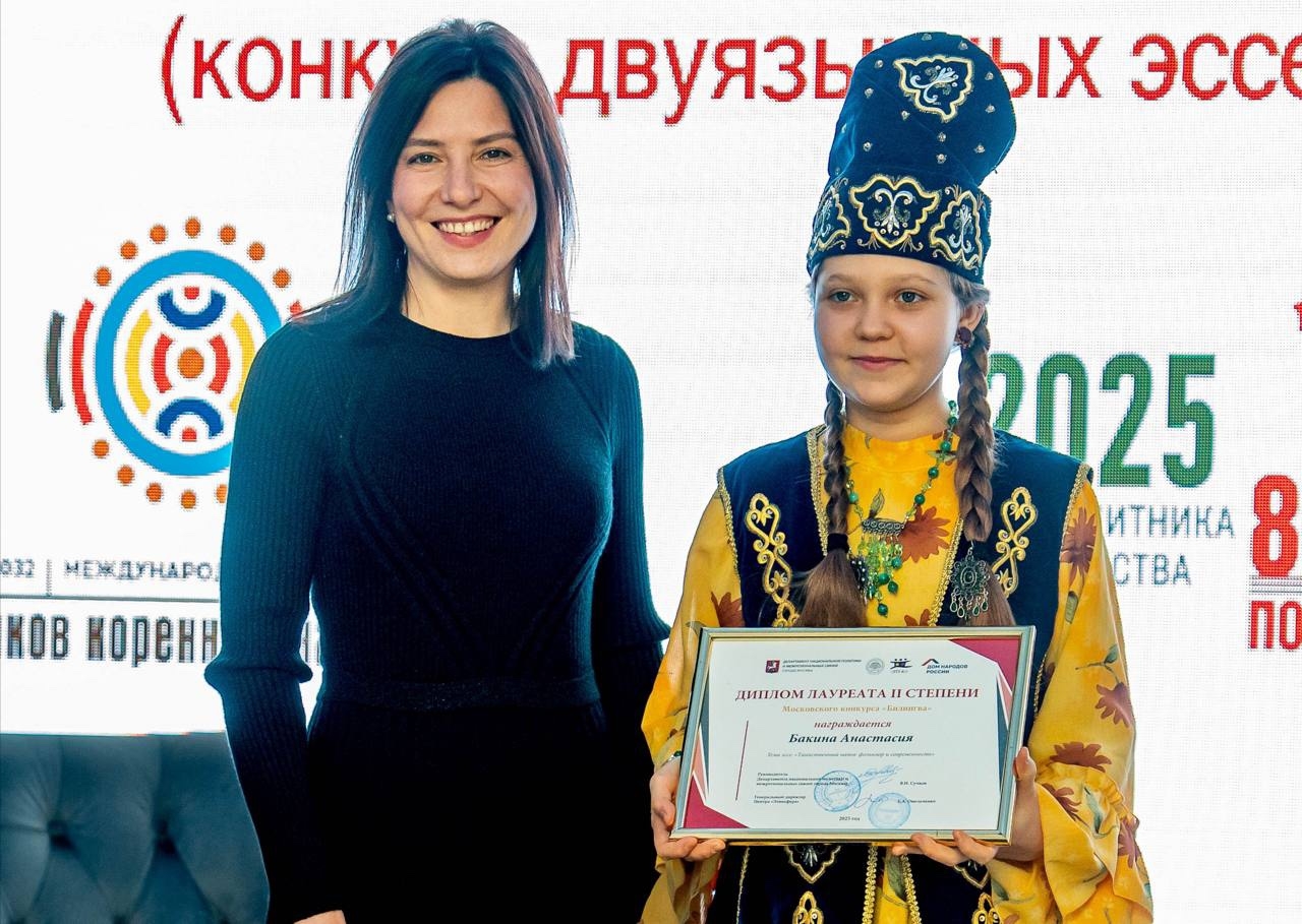 Заместитель директора Дома народов России Елена Башкурова наградила лауреатов в специальной номинации Дома народов России по темам: «Таинственный напев: фольклор и современность» и «История моей семьи в годы Великой Отечественной войны».