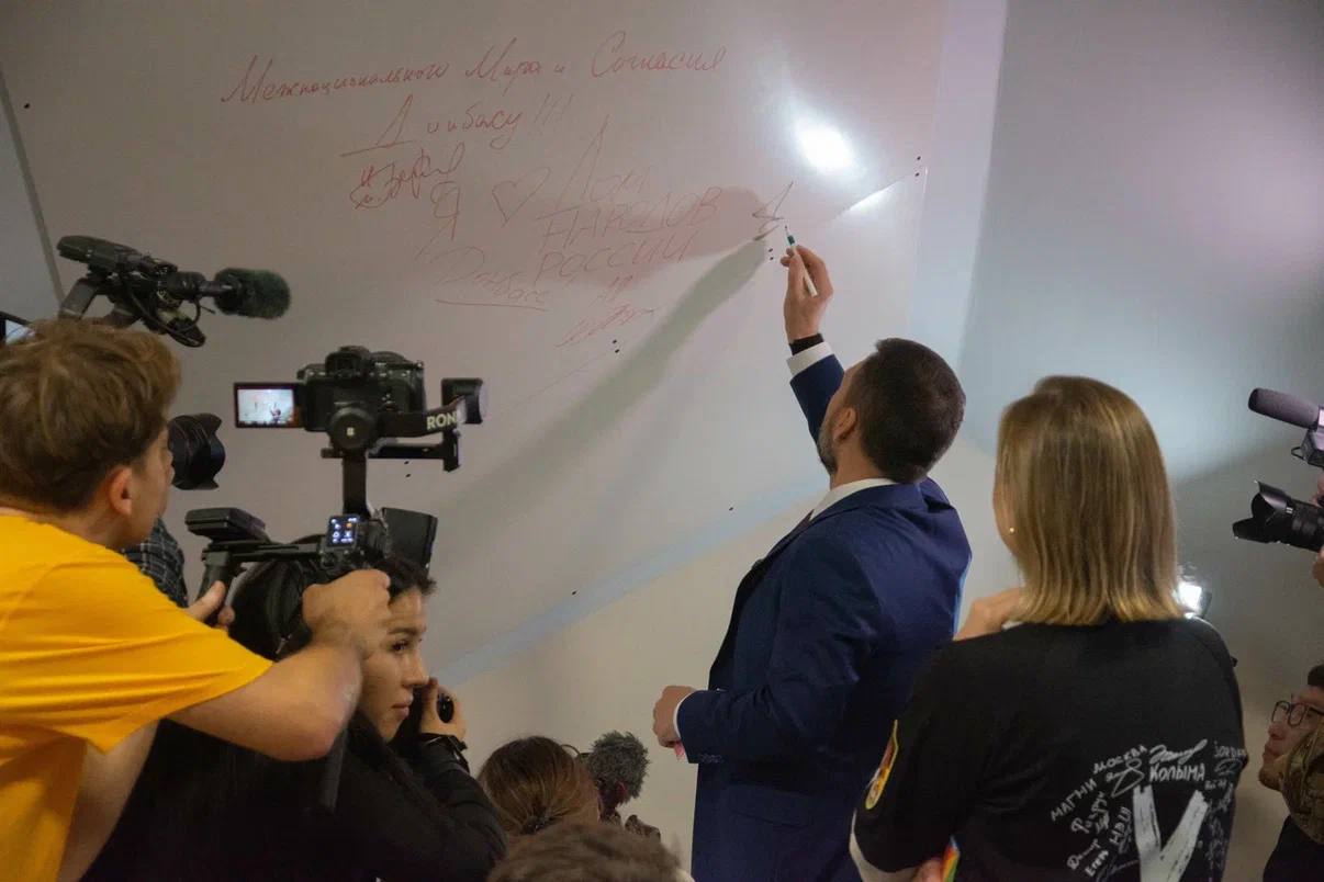 Глава Донецкой Народной Республики Денис Пушилин, руководитель ФАДН России Игорь Баринов и руководитель Дома народов России Анна Полежаева оставили пожелания мира и согласия Донбассу, запечатлев их на стене.
